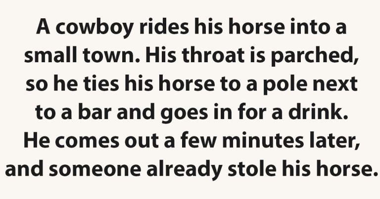 A cowboy rides his horse into a small town. His throat is parched, so he ties his horse to a pole next to a bar and goes in for a drink. He comes out a few minutes later, and someone already stole his horse. The people of the town are looking to see his reaction, … Continue reading A Cowboy and His Horse.